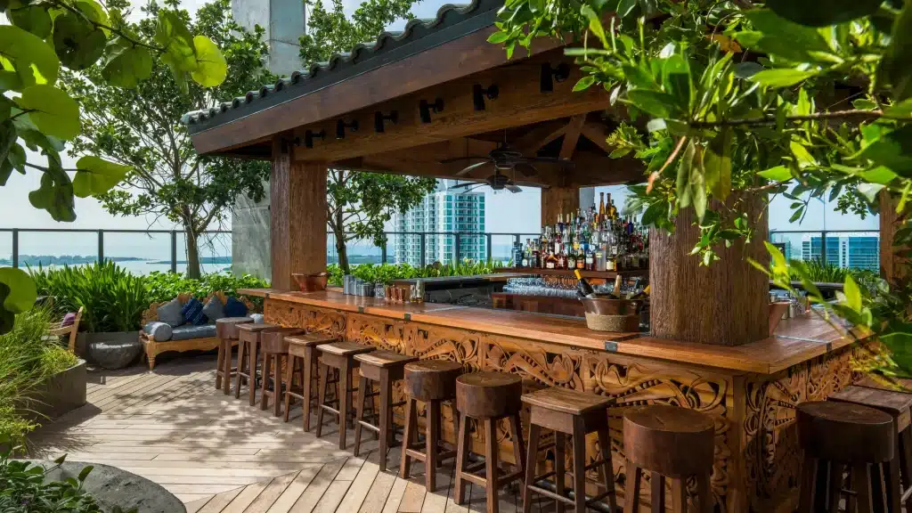 Perched atop the glamorous EAST Hotel Miami on the 40th floor, Sugar is a lush Asian-inspired rooftop oasis that delivers a truly elevated experience. With bamboo chairs, hand-carved Balinese wood, and tiki-style lounges, it’s a tropical garden in the sky. The panoramic views of Brickell, Downtown Miami, and Biscayne Bay are unmatched, making it one of the most breathtaking spots in the city