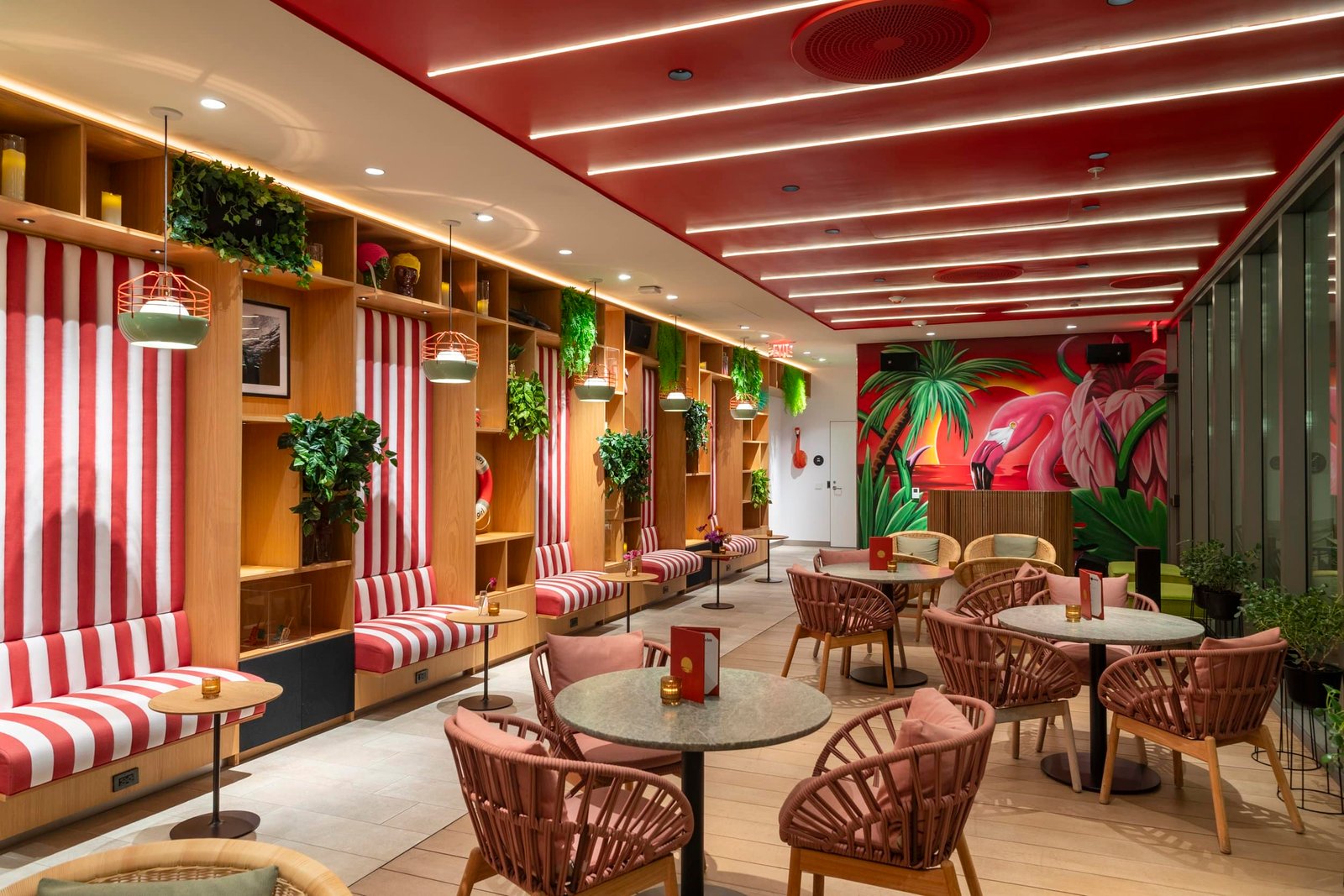 Night Swim takes Miami’s rooftop scene to a more playful, casual level. Located on the 11th floor of the citizenM Miami Worldcenter Hotel, it’s a poolside lounge that mixes modern Miami flair with effortless comfort. The candy-striped pool, red-and-white banquettes, and sweeping views of the Freedom Tower and Kaseya Center make it a standout destination.