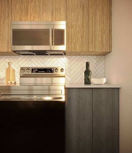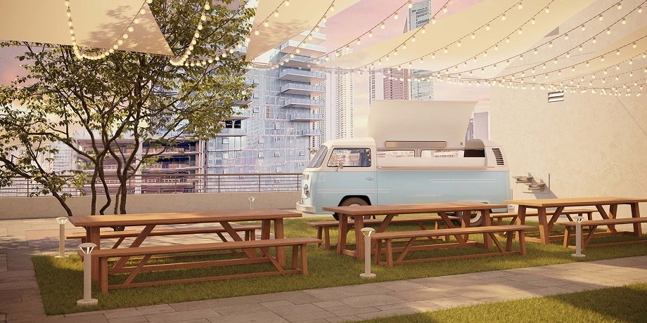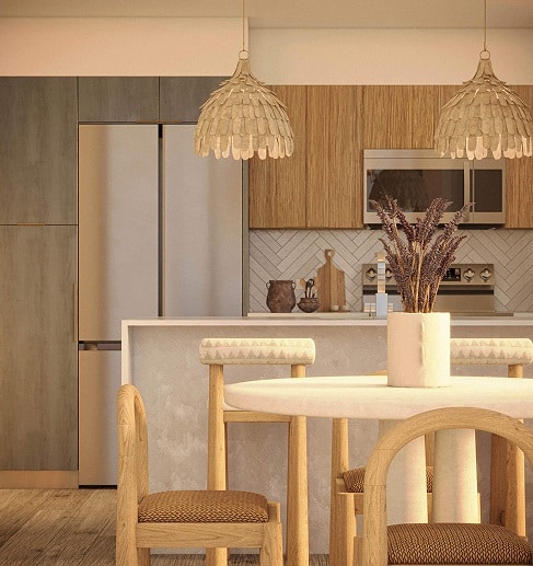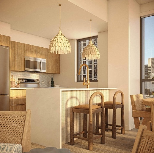 Inside their homes, residents will find spacious 9-foot ceilings, gourmet kitchens, spa-inspired bathrooms with rain showers, and sustainable, custom crafted furniture created by skilled furniture makers using recycled and reclaimed materials. Select units feature private balconies with stunning skyline views, creating an inviting indoor-outdoor lifestyle.