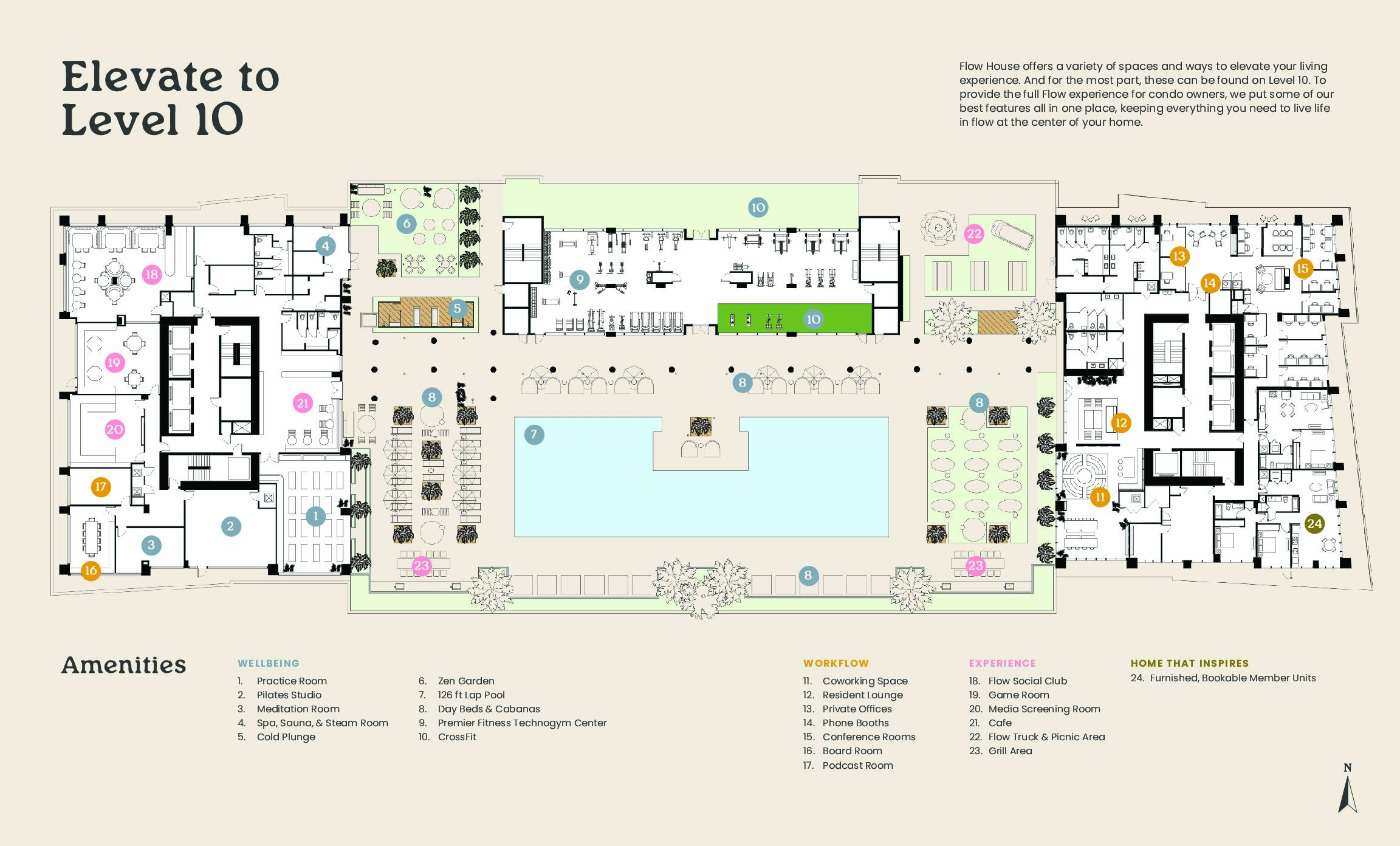 Flow House Miami is more than a residence—it is a new residential community designed to foster well-being, connection, and purposeful living. Residents will enjoy resort-style amenities that promote health and social engagement, including a 24-hour fitness center equipped with Technogym and Rogue equipment, group classes such as yoga, power sculpt, and high-intensity interval training, plus dedicated turf areas for outdoor workouts. Residents also enjoy sound healing fitness classes and wellness weekly classes through the Flow mobile app.